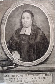 Darauf ist M. Christoph Mattheus Seidel (1668 - 1723) zu sehen. Es ist ein sehr seltener Porträtstich, der den einzigen im Bild nachweisbaren Täufling vom kursächsischen Hofkapellmeister Heinrich Schütz abbildet. Seidel besucht u.a. auch das Gymnasium illustre Augusteum in Weißenfels, um sich in Philosophie, Sprachen und Theologie auf ein Universitätsstudium vorzubereiten. Dank seiner universellen Gelehrsamkeit wurde Seidel Mitglied der Königlich-Preußischen Sozietät der Wissenschaften zu Berlin.